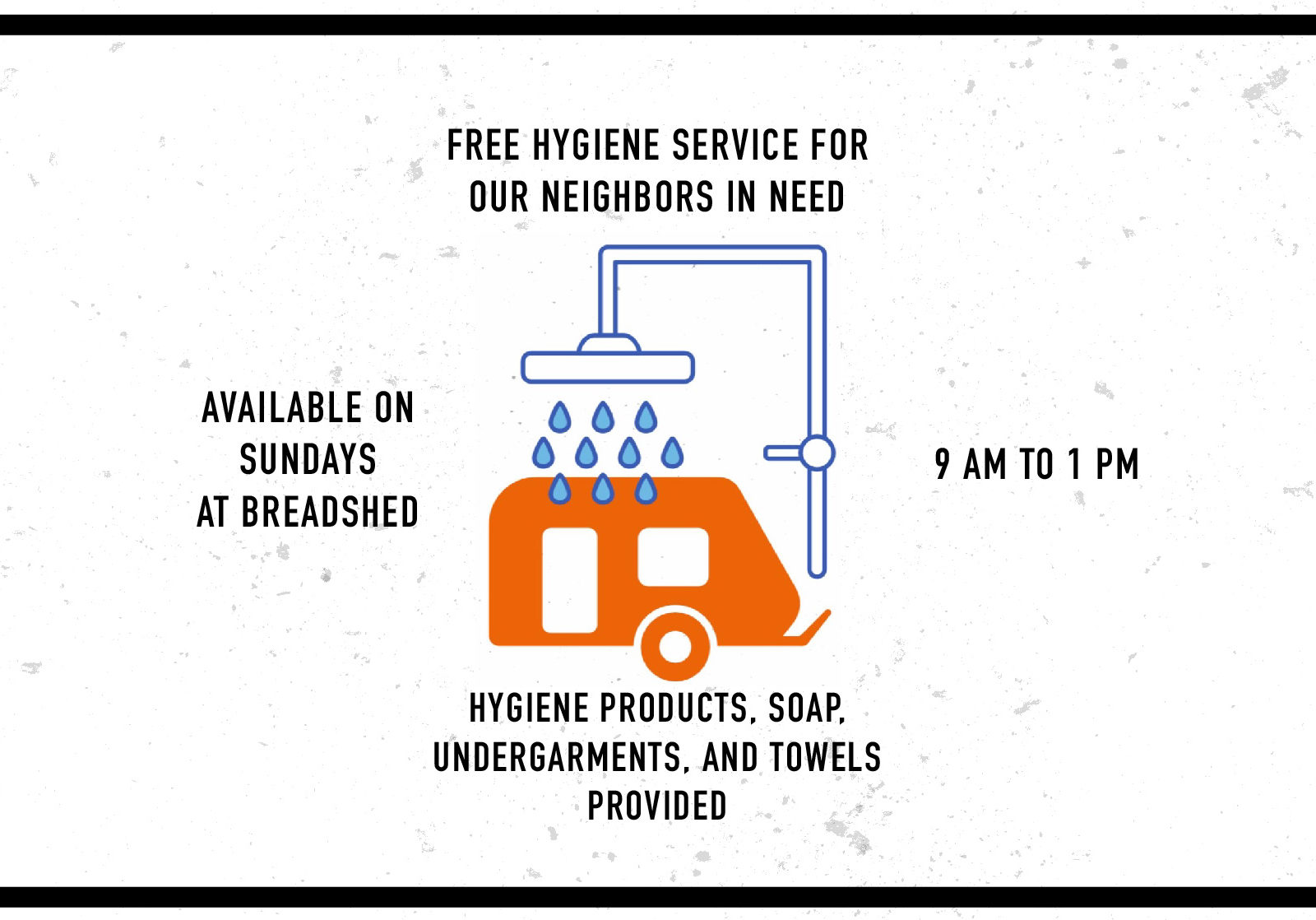 New! Mobile shower is available on Sundays at Bread Shed from 9am to 1 pm for our neighbors in need. Hygiene products, soap, undergarments, and towels are provided.